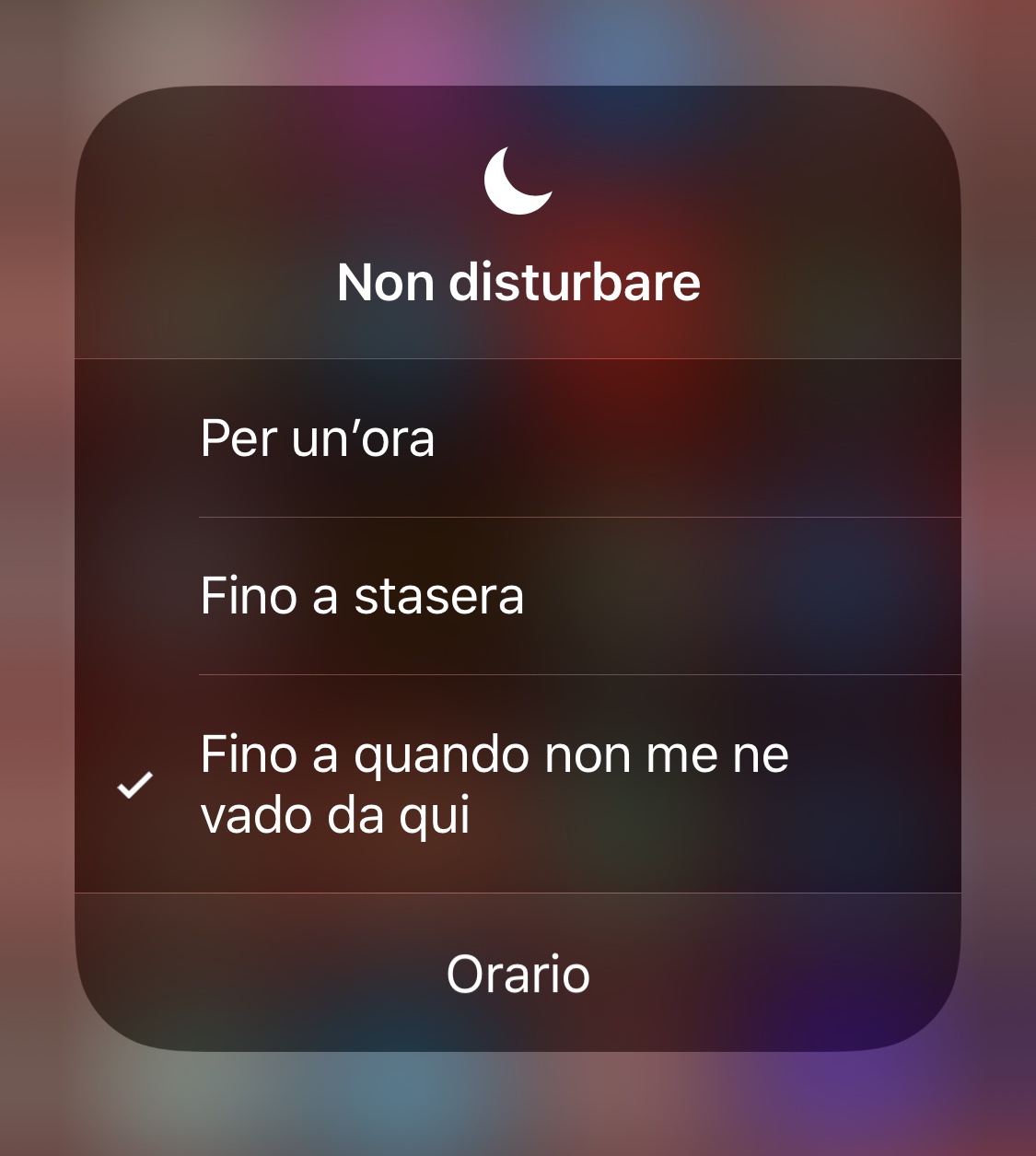 La prossima volta che andrete al cinema, scorrete verso il basso per aprire il Control Center sull’iPhone e poi l’icona che assomiglia a una fetta di luna (premete con decisione) e vedrete il menu in alto a comparsa, quindi semplicemente toccate “fino a quando non lascerò questa posizione”.