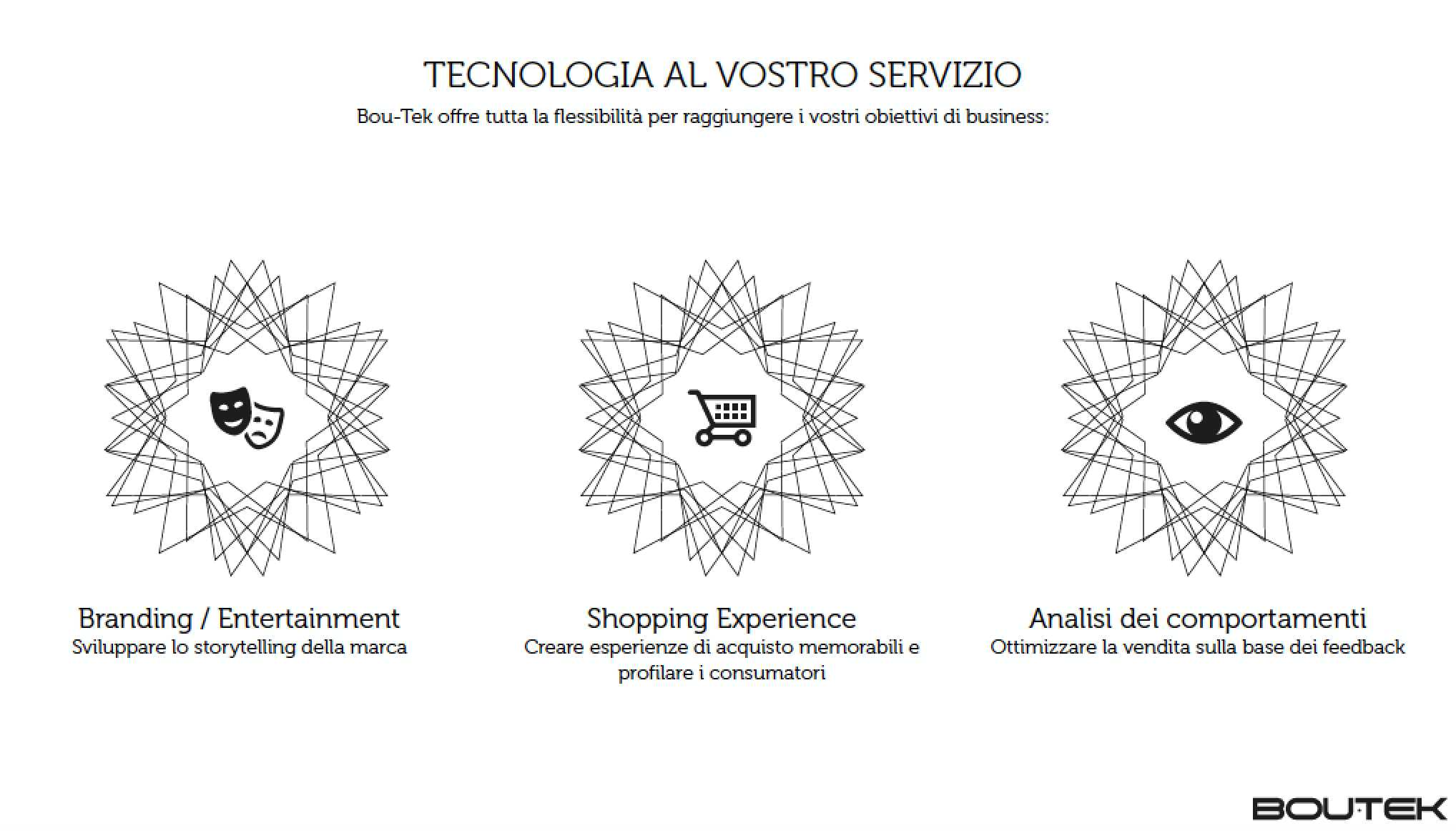 È la tecnologia, appunto, il cuore pulsante di Bou-Tek, che trova linfa vitale in big data, app, sistemi di sensori e interazioni con i social network. Tutti questi elementi si trasformano in alleati strategici di business, per estrarre informazioni, profilare utenti, monitorare comportamenti, offrire comunicazioni personalizzate e tarate sulle esigenze dei consumatori.
