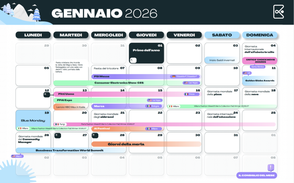 Analizzando il calendario 2026 proposto da Kolsquare, emerge un dato interessante: ogni mese porta con sé non solo festività o ricorrenze, ma contesti narrativi.