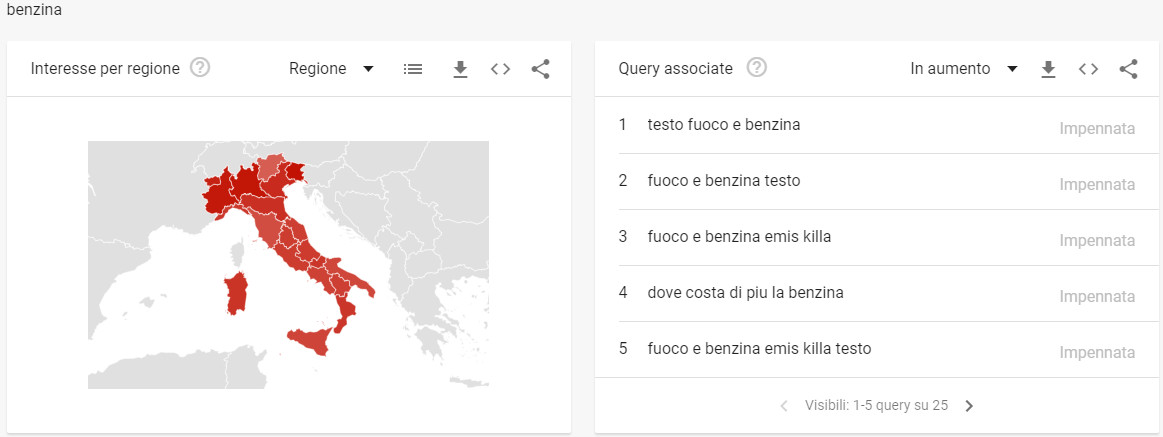 La ricerca circa la benzina, nel momento in cui scrivo, è influenzata dall’uscita di un pezzo rap, ma è interessante notare come l’attenzione sia economica, circa il costo – sempre più alto – del carburante. Anche per il diesel, si tratta di ricerche più “preoccupate” da ecotasse e dis-incentivi all’utilizzo di questo tipo di auto, ponendo un trend di ricerca più negativo che altro. Mentre per quanto riguarda gpl e hybrid si guarda al futuro, dato che andiamo a trovare in crescita i modelli di auto che montano questi innovativi sistemi.