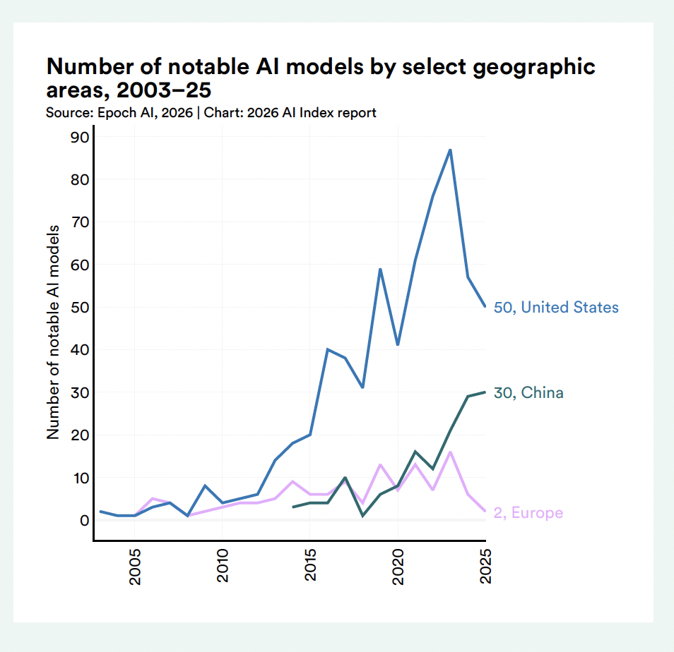 Stanford AI Index 2026 sul ruolo dell’Europa: 3 modelli prodotti nel 2025. Ma l’AI Act ridisegna le regole globali
