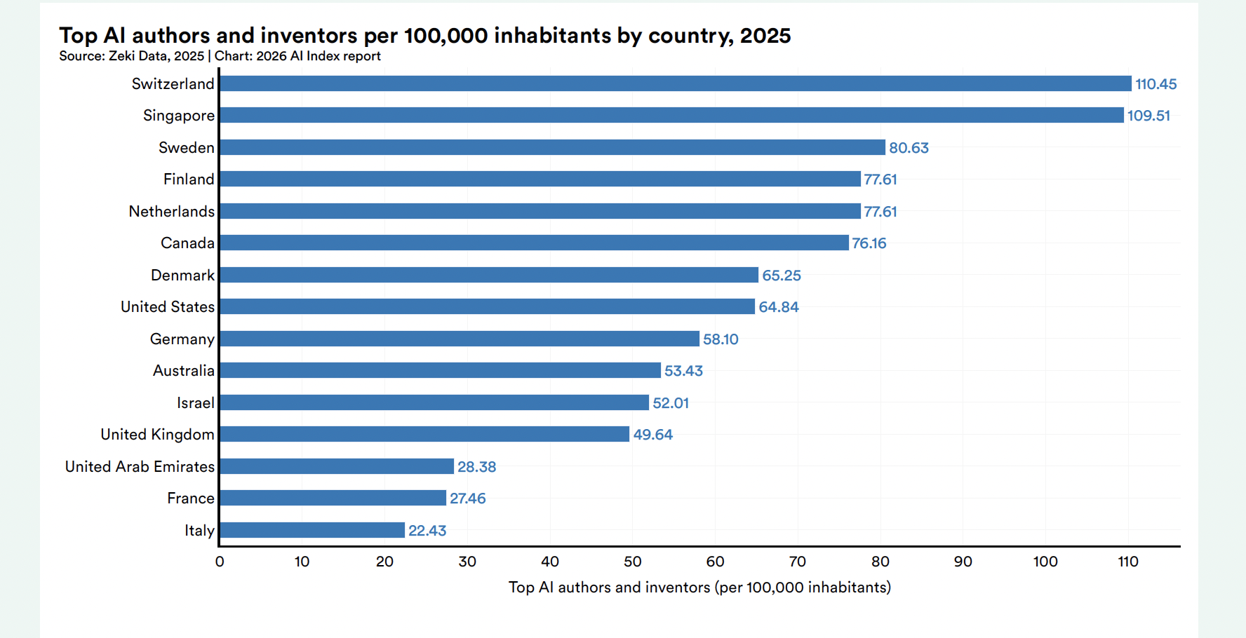 Tra i paesi europei con il dato di adozione più alto si trovano la Norvegia con il 46,4%, l’Irlanda con il 44,6% e la Francia con il 44%; tutti e tre sopra la media americana del 28,3%, che colloca gli USA al 24° posto nella classifica globale. La Svizzera si attesta al 32,4%, già sopra gli USA, e il rapporto la individua anche come primo paese al mondo per densità di ricercatori e sviluppatori AI pro capite, con 110,5 autori e inventori ogni 100.000 abitanti, davanti a Singapore e ben sopra la Germania a 58,1 e il Regno Unito a 49,6.